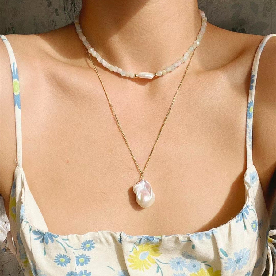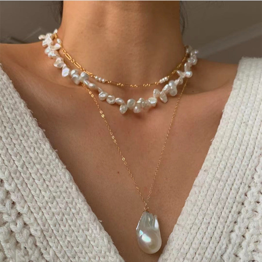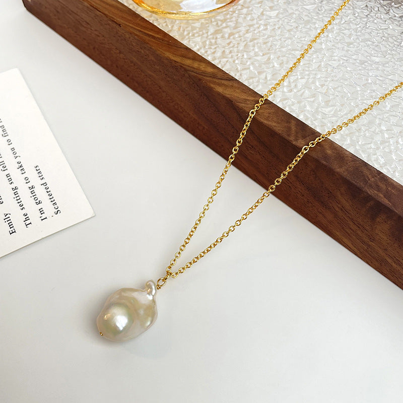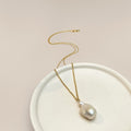 Crafted from high-quality copper, the pendant and chain are meticulously plated with 24K gold, ensuring a luxurious shine that withstands the test of time.The centerpiece of this necklace is a stunning Baroque pearl, known for its irregular beauty where no two pearls are alike in size and shape.This unique attribute adds an organic, one-of-a-kind allure to your ensemble.
